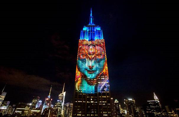 In a breathtaking spectacle, Goddess Kali was projected on the Empire State Building in New York. From Wikipedia; Kālī (/ˈkɑːli/; Sanskrit: काली & Bengali: কালী; IPA: [kɑːliː]), also known as Kālikā (Sanskrit: कालिका), is the Hindu goddess associated with empowerment, or shakti. She is the fierce aspect of the goddess Durga.[1] The name of Kali means black, time, death, lord of death; she is therefore called the Goddess of Time, Change, Power, and Destruction.